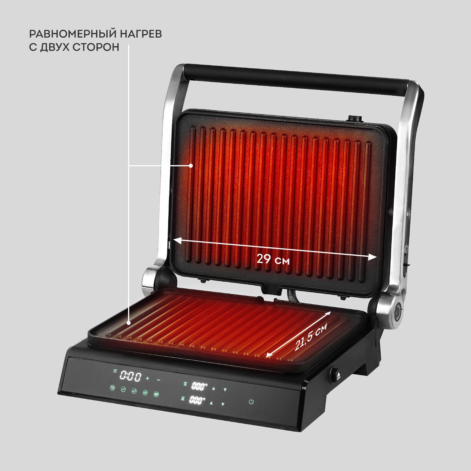 | Дополнительная информация | Регулятор температуры: для верхней и нижней поверхности; Регулировка времени приготовления: от 1 минуты до 4 часов; LED-подсветка |