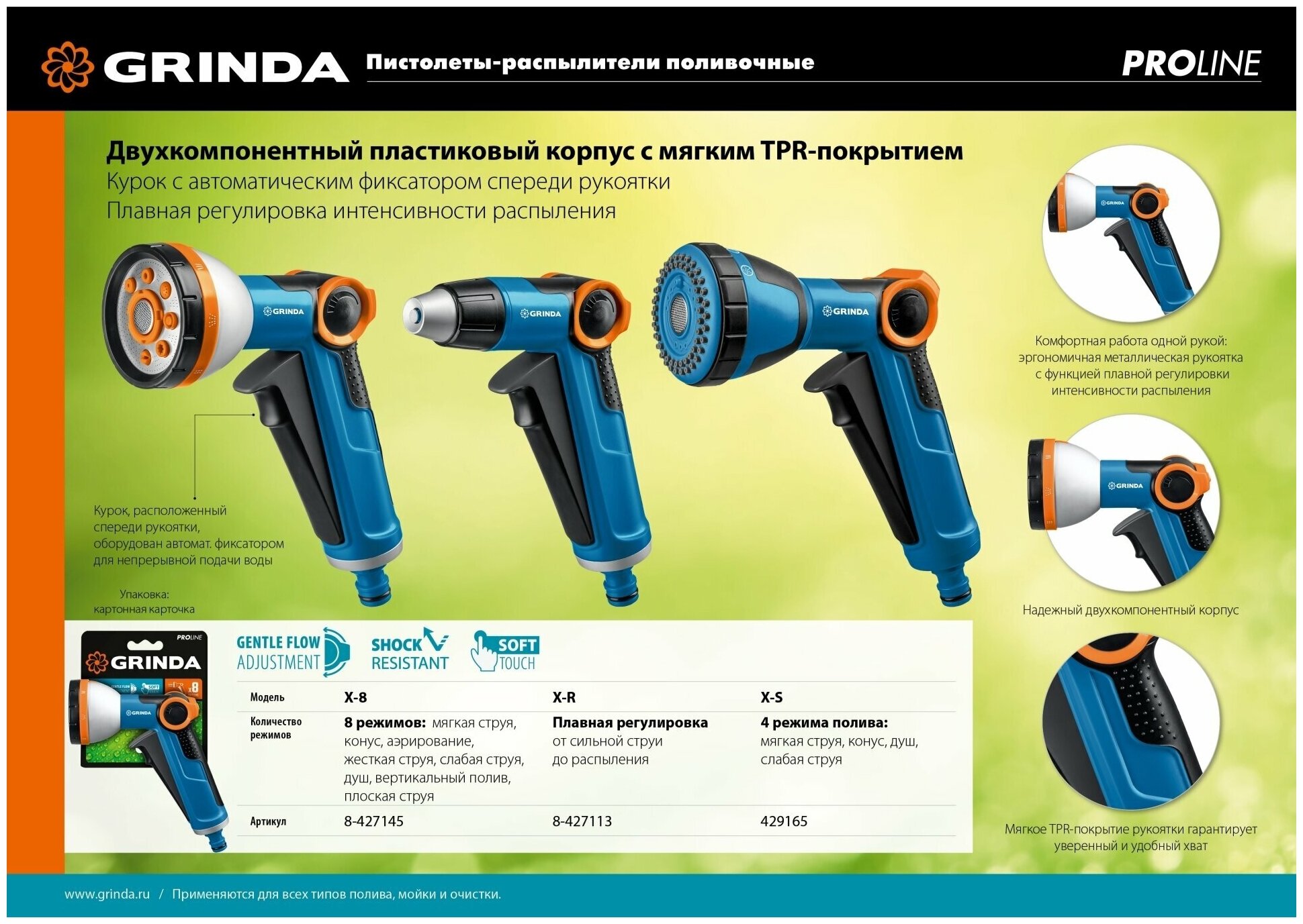 Пистолет-распылитель Grinda поливочный PROLine X-R с регулятором напора, плавная регулировка, курок спереди, двухкомпонентный информация: