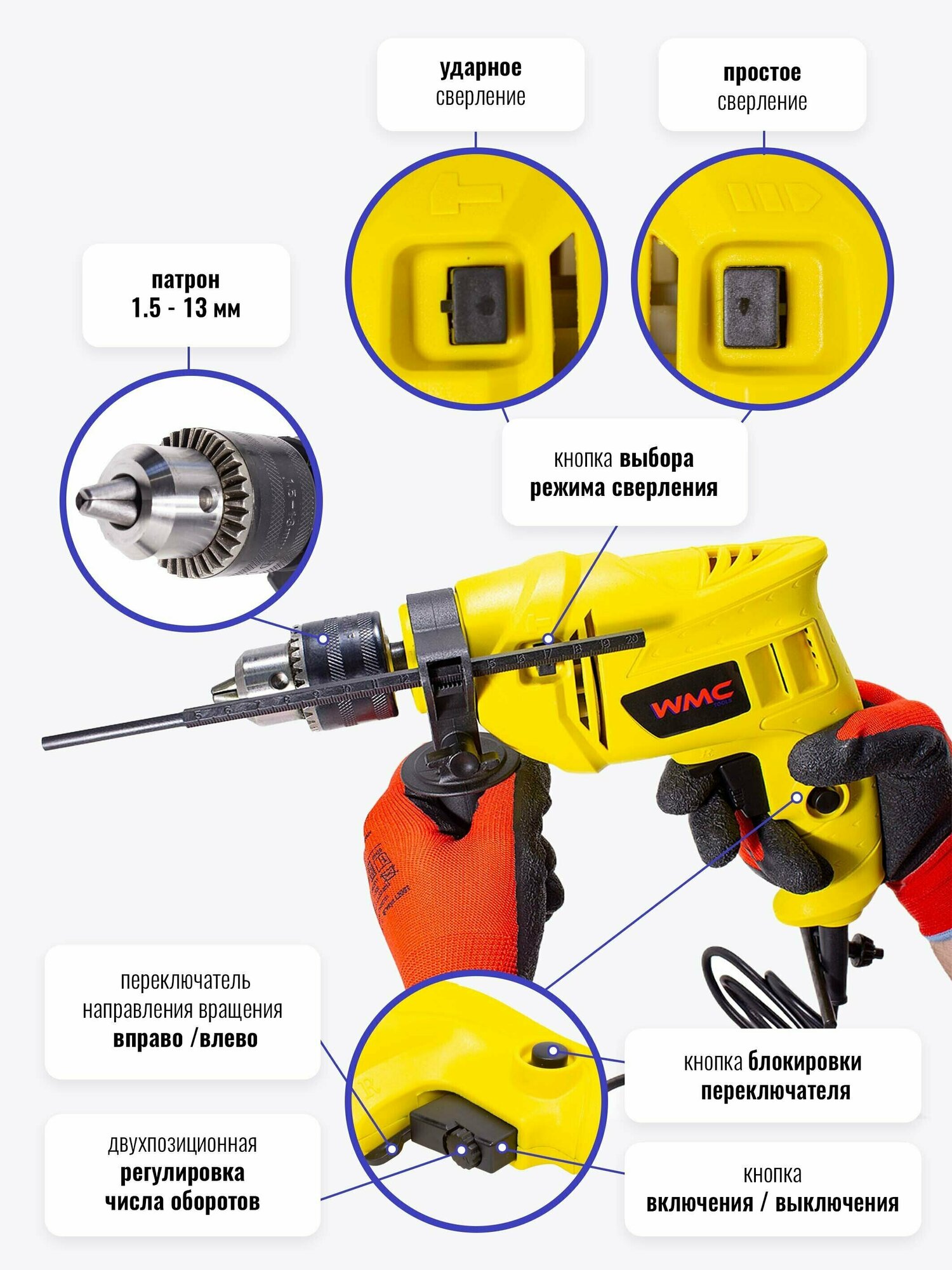 WMC TOOLS WMC-Z1J-DH31-13 Дрель ударная 500Вт, 3100 об/мин., патрон 1.5-13мм с аксессуарами WMC TOOLS информация: