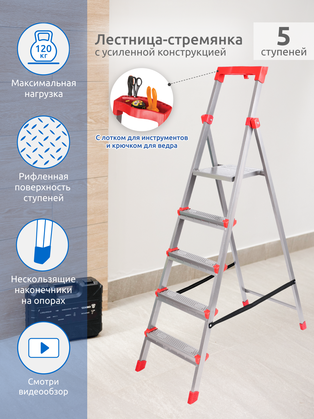 10 цен на Стремянка металлическая 5 ступеней, высота до платформы 1060 мм, вес 6,8 кг, до 150 кг, ННСУ5