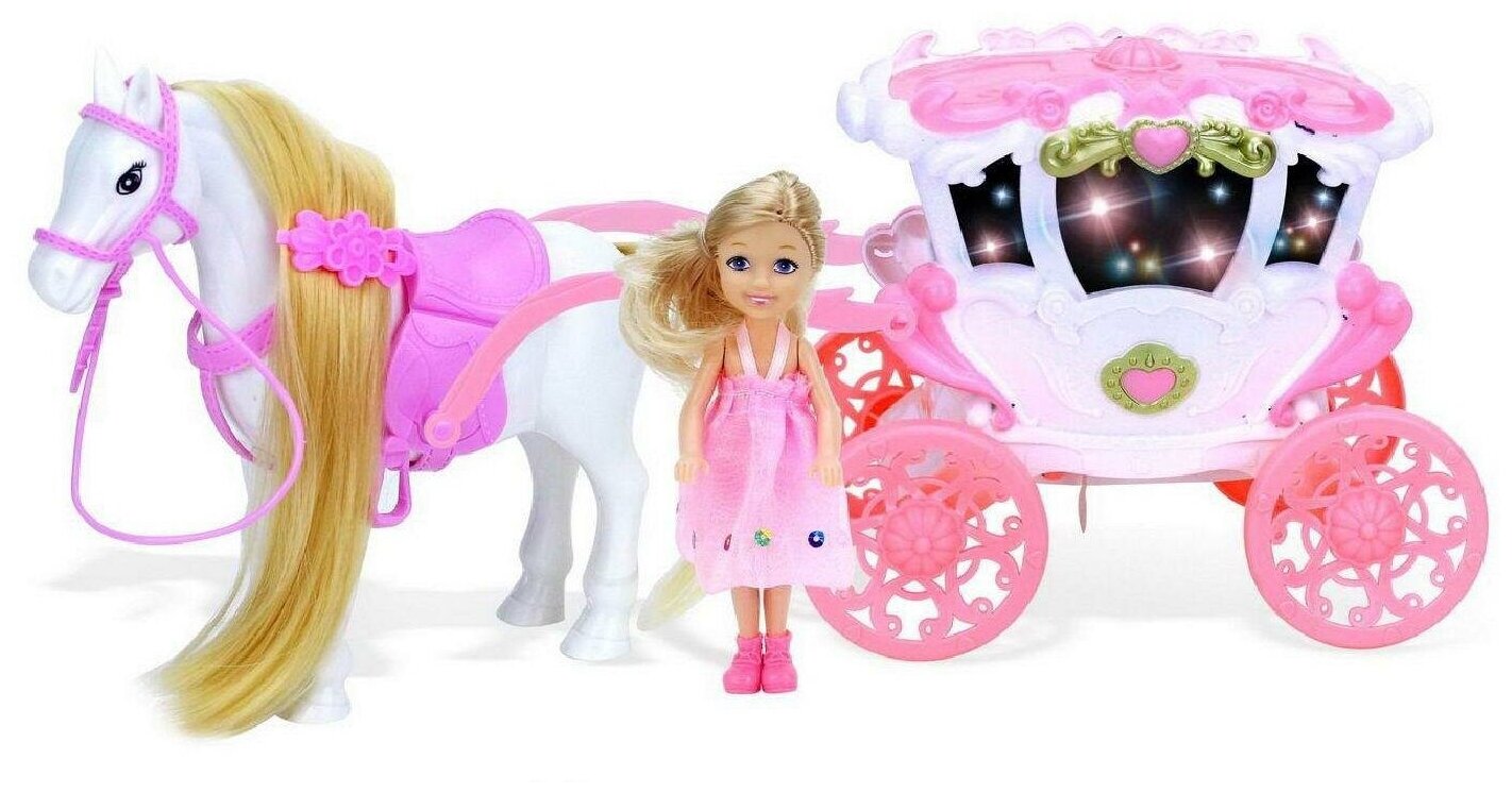 Лошадка в наборе с бело-розовой каретой и куколкой, со световыми и звуковыми эффектами, в коробке 38х12,5х19см