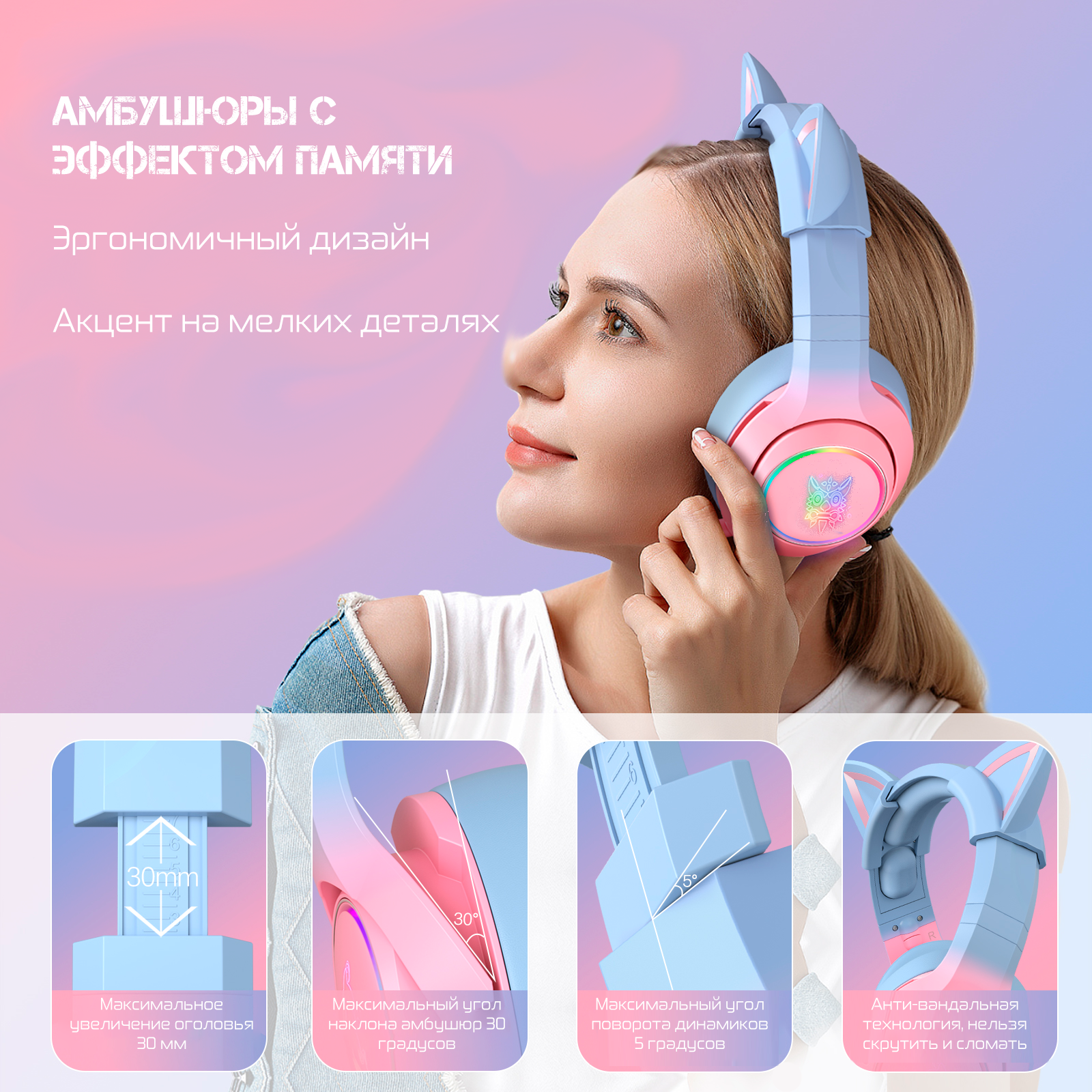 Игровые проводные наушники ONIKUMA K9 с RGB подсветкой и съемными ушками, Голубые с розовым 2 790 ₽