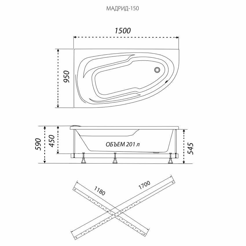 Акриловая ванна 1ACReal Мадрид -правая 150x95 с каркасом, белая информация: