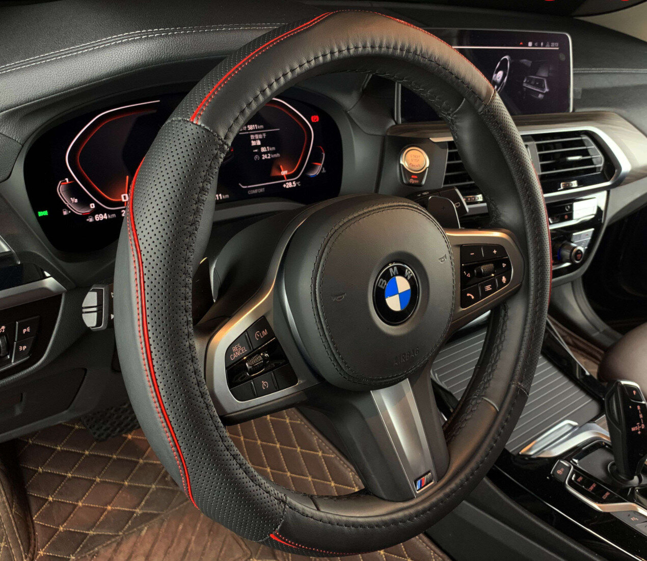 Оплетка на руль (M 38 см натуральная кожа) черная с перфорацией с красными линиями Premium информация: