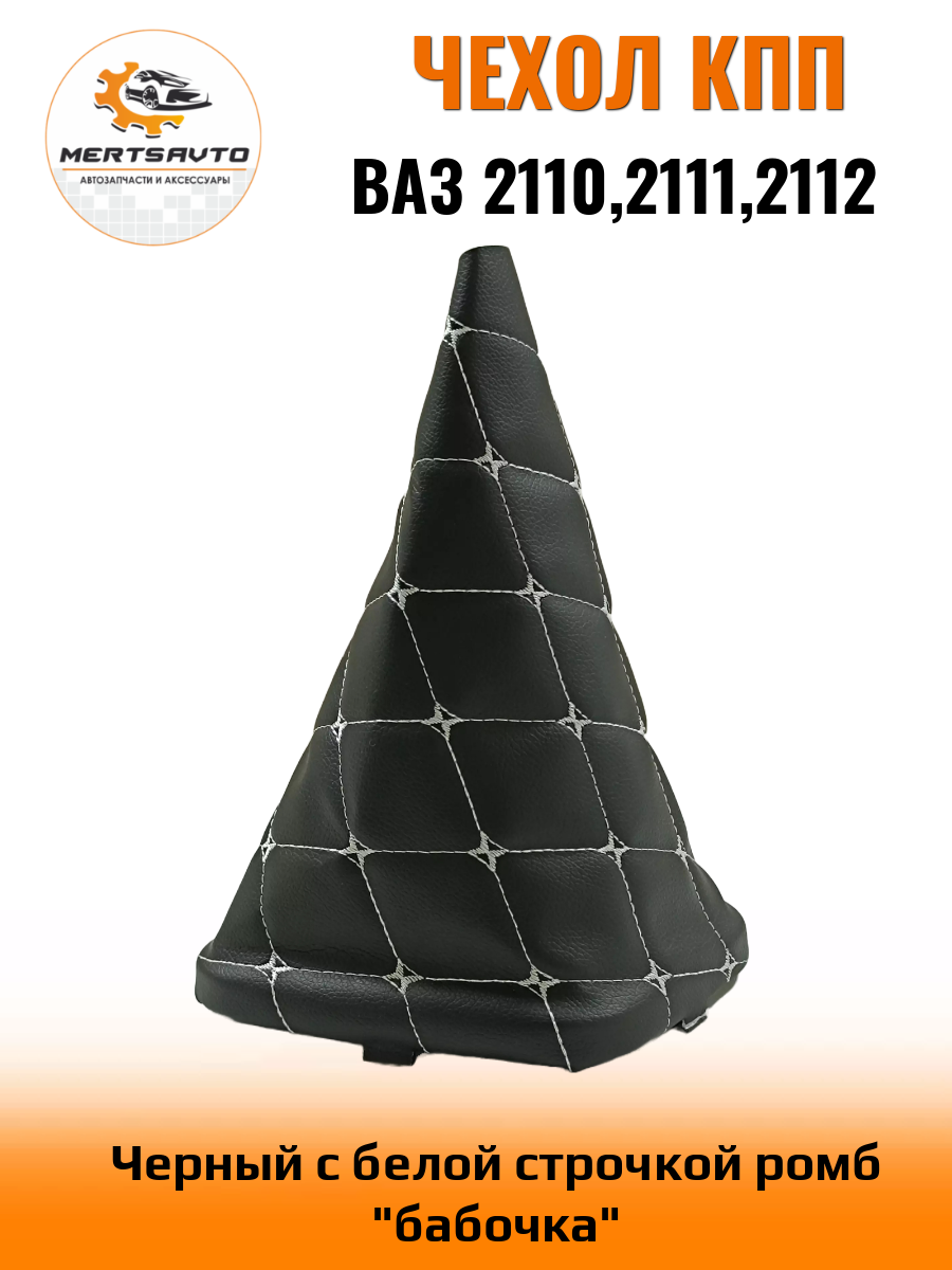 Чехол коробки переключения передач (КПП) на ВАЗ-2110, ВАЗ-2111, ВАЗ-2112 (Lada, Лада) - черный с белой строчкой ромб "бабочка" информация: