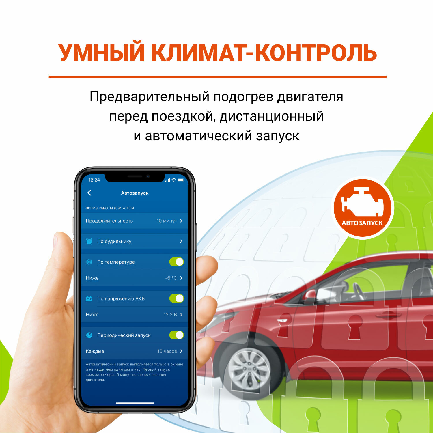 | Автозапуск двигателя | по дням недели / по заданному времени / по температуре / при низком заряде АКБ / через заданные интервалы |