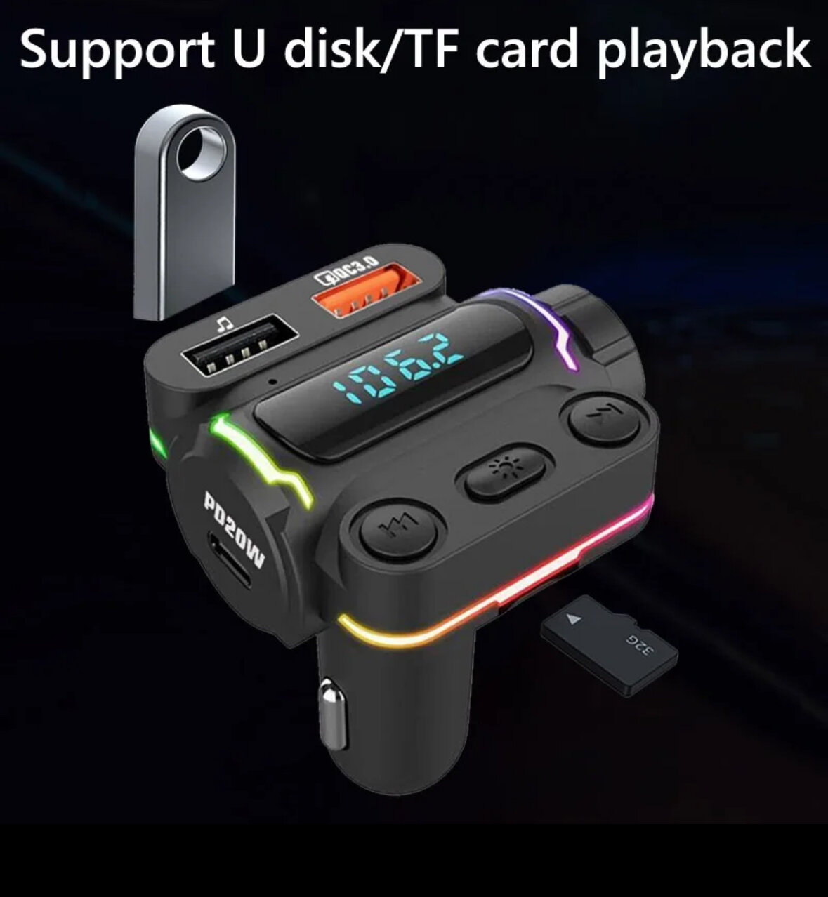 FM-трансмиттер Rapture KSC-1064 Bluetooth, Type-C QC3.0 40W, громкая связь, подсветка RGB информация: