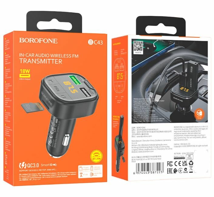 FM модулятор с быстрой зарядкой 18w USB TF Bluetooth Borofone BC43 black информация:
