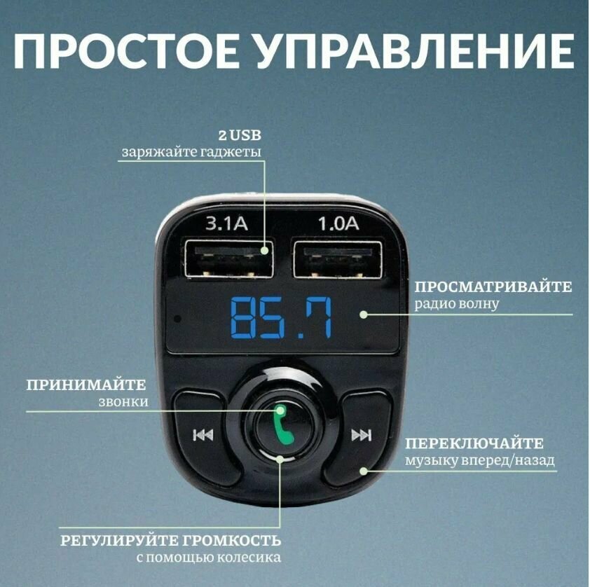 FM трансмиттер Bluetooth, с дисплеем и зарядкой USB, индикация бортового напряжения (АЗУ с вольтметром)