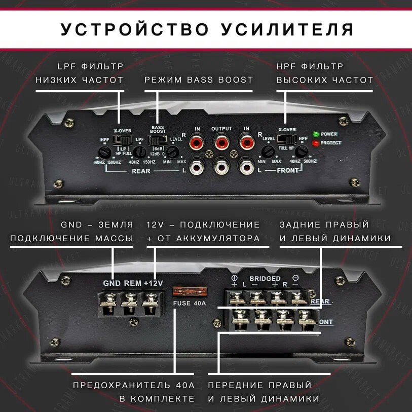 | Комплектация | Усилитель, Предохранитель 1шт 40А, Саморезы для крепления 4шт, Инструкция на английском, Коробка |