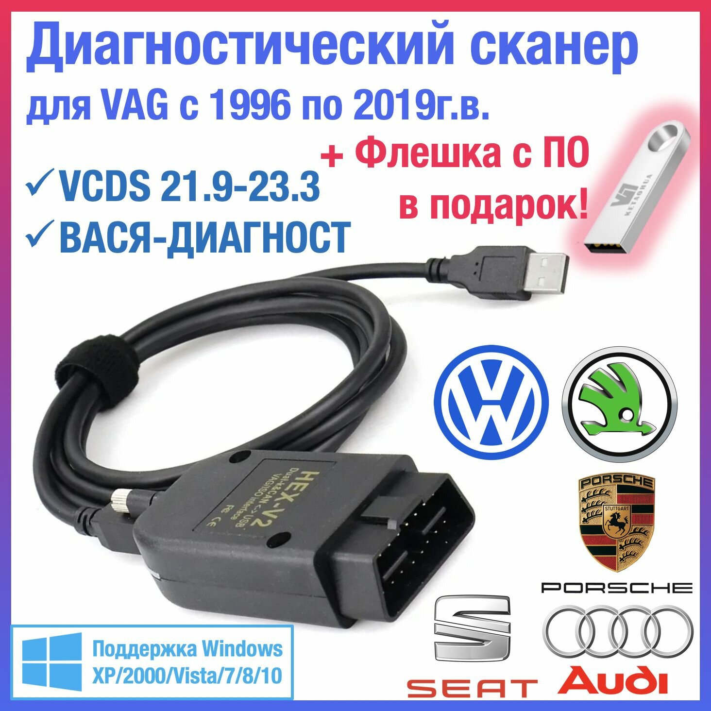 Диагностический сканер для VCDS и Вася диагност, VAG-COM для Volkswagen/Skoda/Audi c 1998 по 2019 г.в., VAGCOM HEX V2 OBD2 оригинальный чип ATMEGA162 информация: