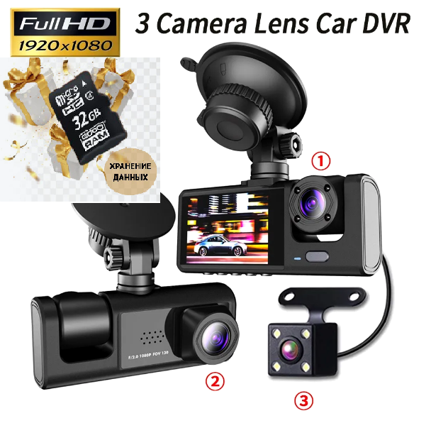Отзывы на Автомобильный видеорегистратор Full HD, с 3 камерами,видеорегистратор с задней камерой.Флешка 32 гб в подарок.