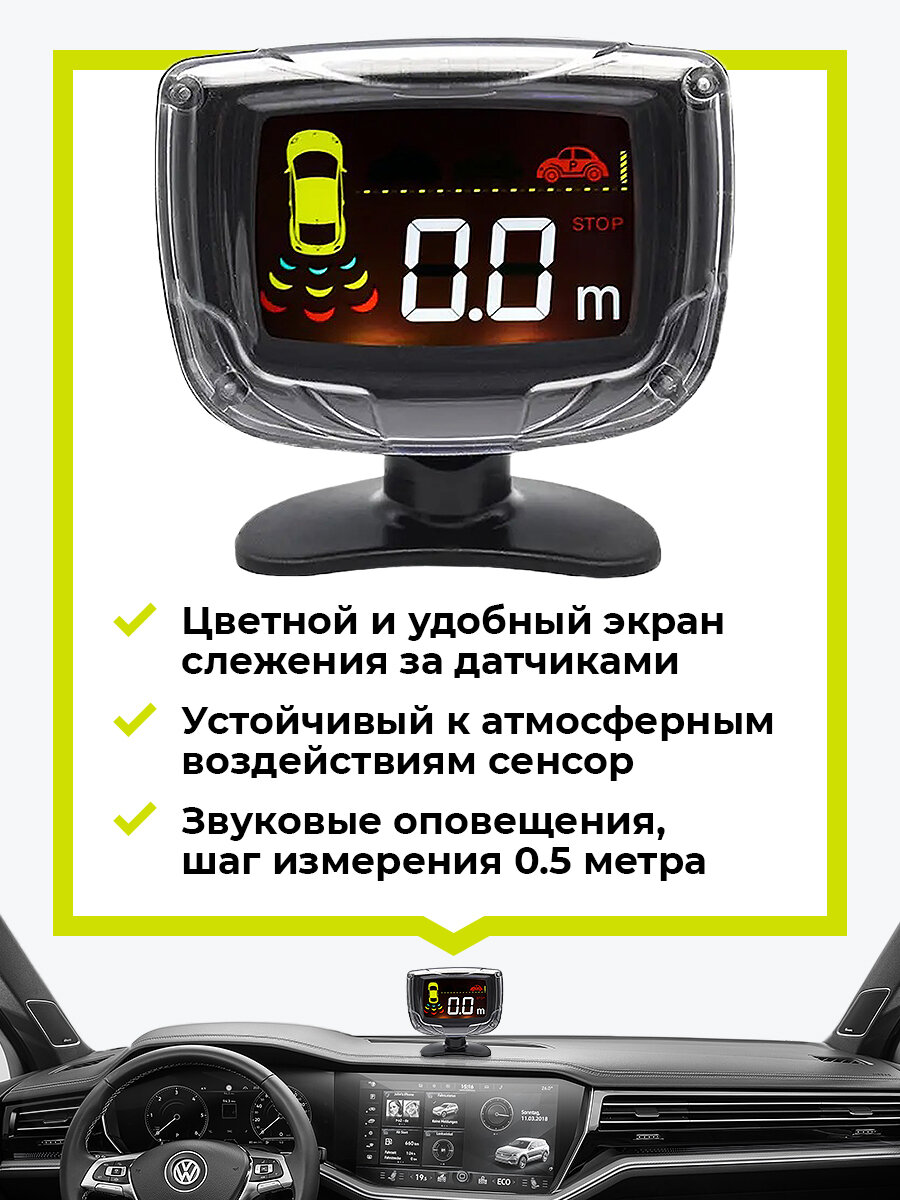 | Дополнительная информация | Очень удобный девайс для всех автовладельцев. Легко устанавливается, работает бесперебойно. Большой и очень удобный ЖК-Дисплей. Длина провода 2.5 метра, что позволяет спокойно установить парктроники на любую машину.Гарантия на товар 1 год. |