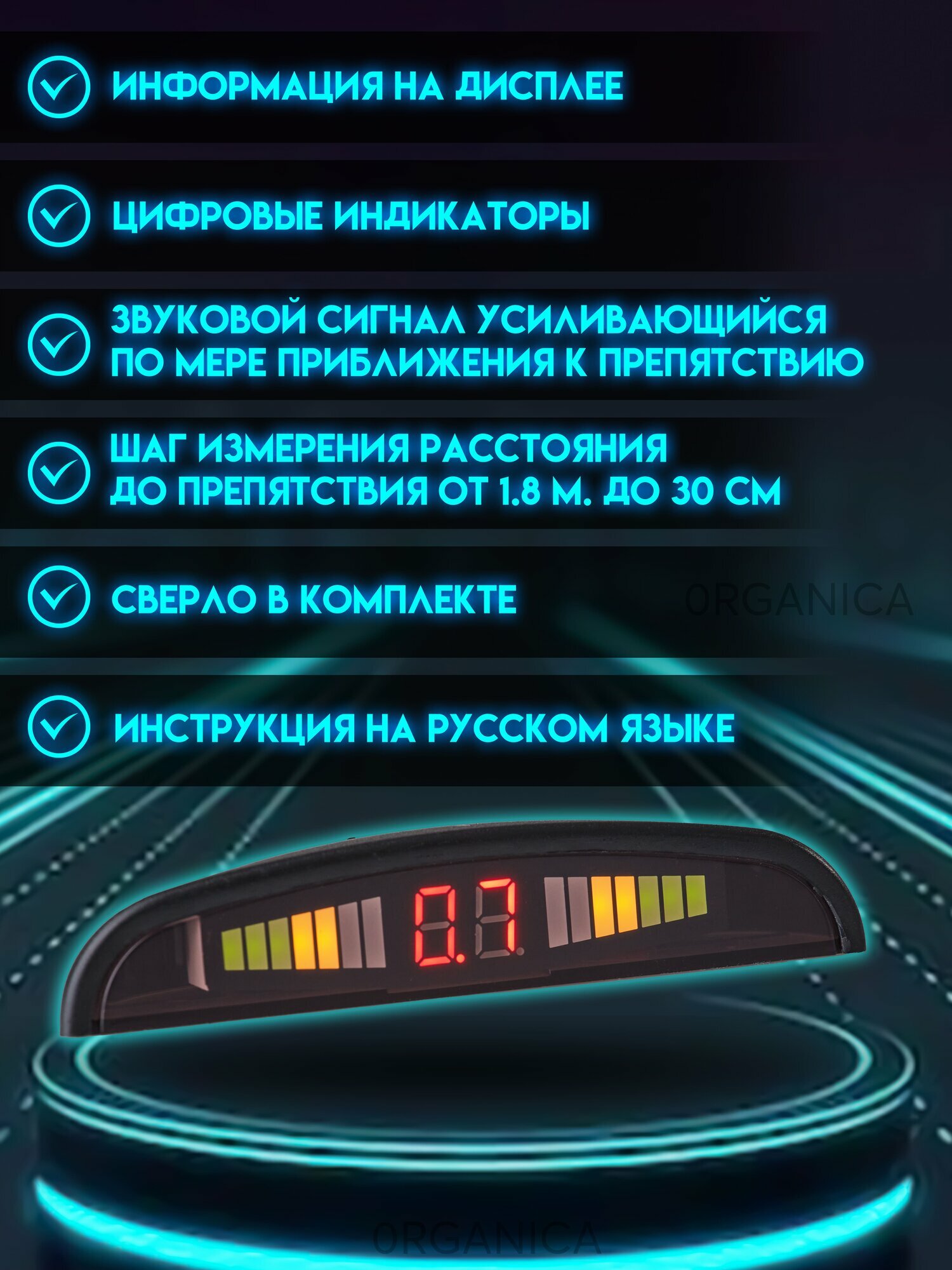 | Особенности | активация задней передачей / встроенный динамик / окрашиваемые датчики |