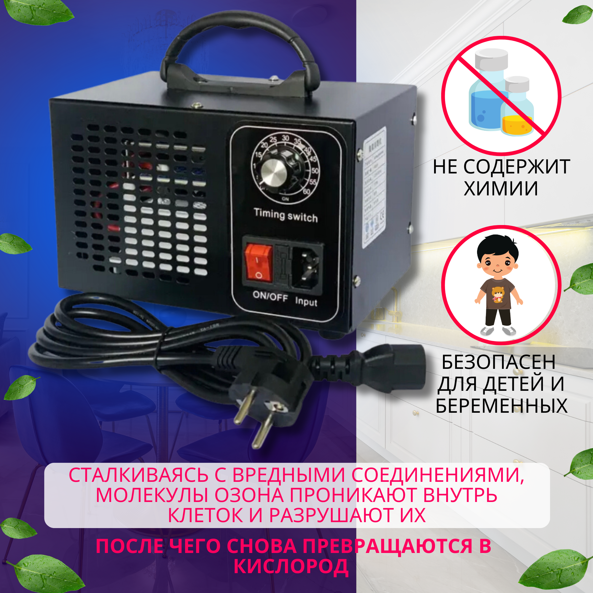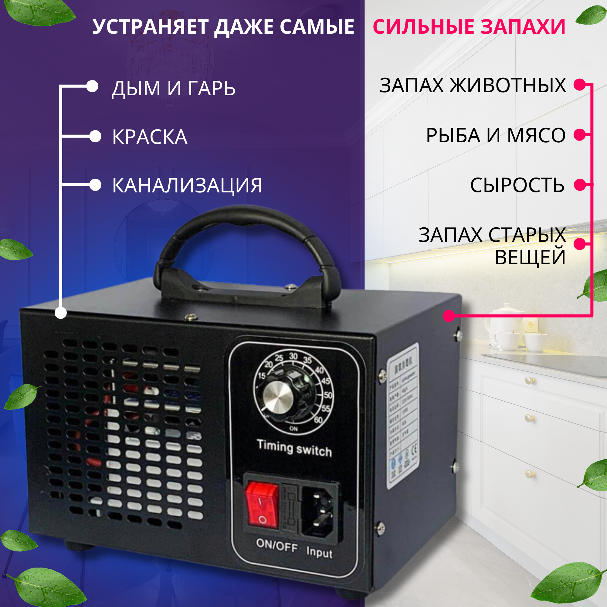 Озонатор 500 мг/час, 220AC/12DC с таймером. Очиститель и очиститель воздуха, воды, продуктов и холодильника, охват до 50 м2. Озонатор для дома.