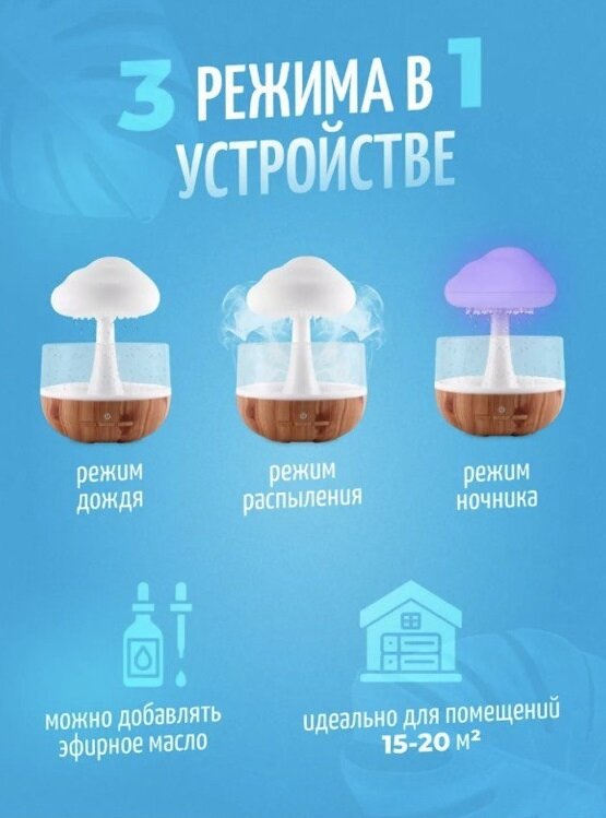 Многофункциональный увлажнитель воздуха Гриб с эффектом дождя для создания идеального климата/Синий 3 287 ₽