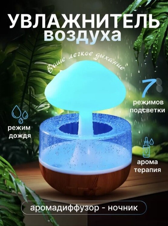 Многофункциональный увлажнитель воздуха Гриб с эффектом дождя для создания идеального климата/Синий 3 287 ₽