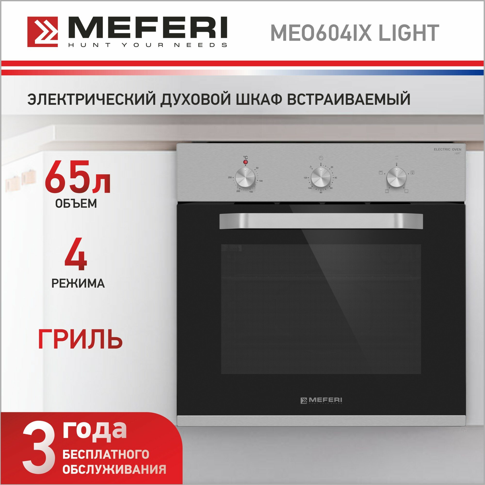 Встраиваемый электрический духовой шкаф MEFERI MEO604IX LIGHT, с грилем, серебристый информация: