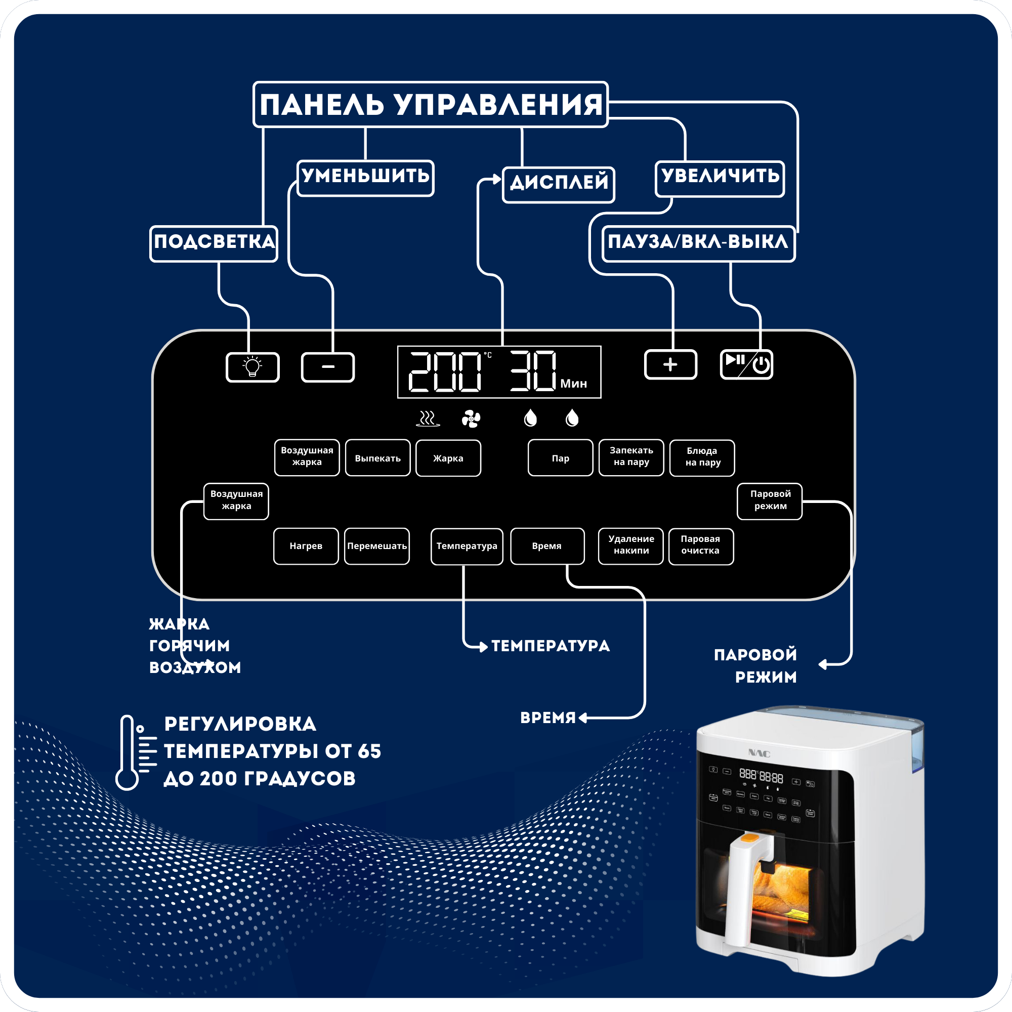| Особенности | звуковой сигнал о готовности, пар, температура пара 100гр Цельсия, температура готовки от 30 до 200 градусов, функция удаления накипи, стерилизация внутренней поверхности, сенсорная панель, смотровое окно |