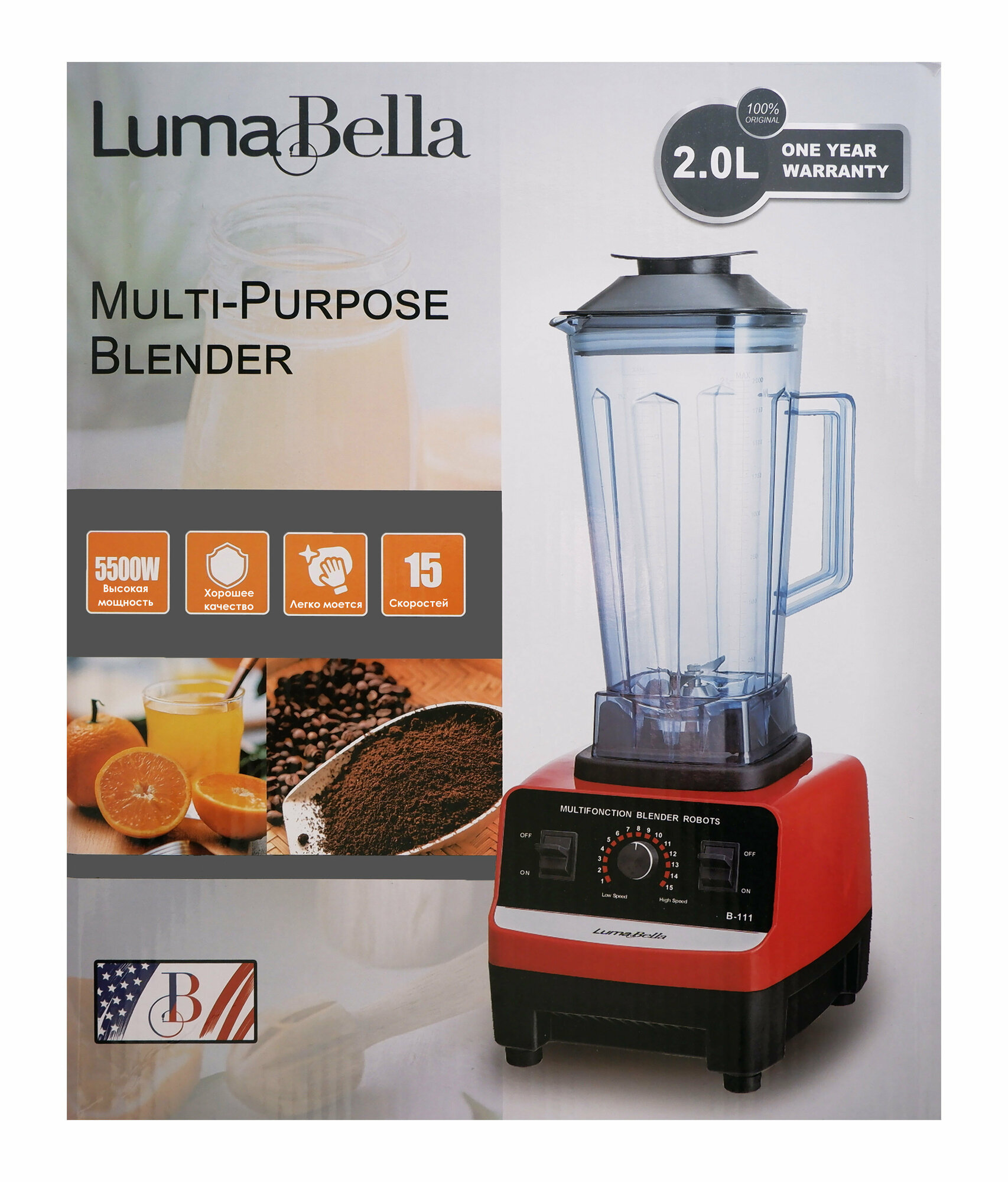 Блендер стационарный,Luma Bella,домашний,измельчитель для льда и смузи,5500 Вт,легкая очистка, кувшин 2 литра 15 скоростей информация: