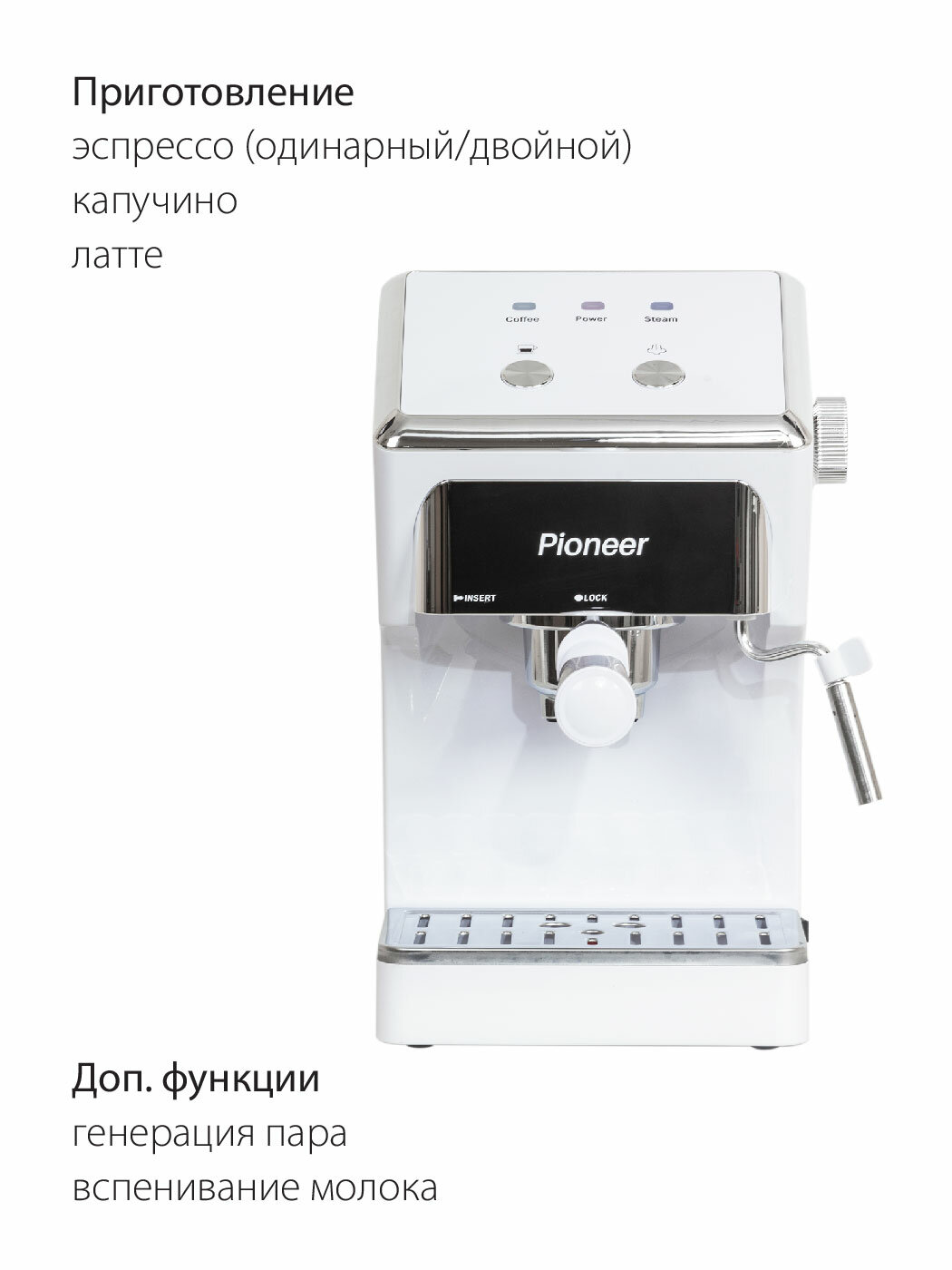 10 цен на Рожковая кофеварка для дома профессиональная Pioneer CM115P white с капучинатором, электронное управление, эспрессо/капучино/латте, мгновенный нагрев