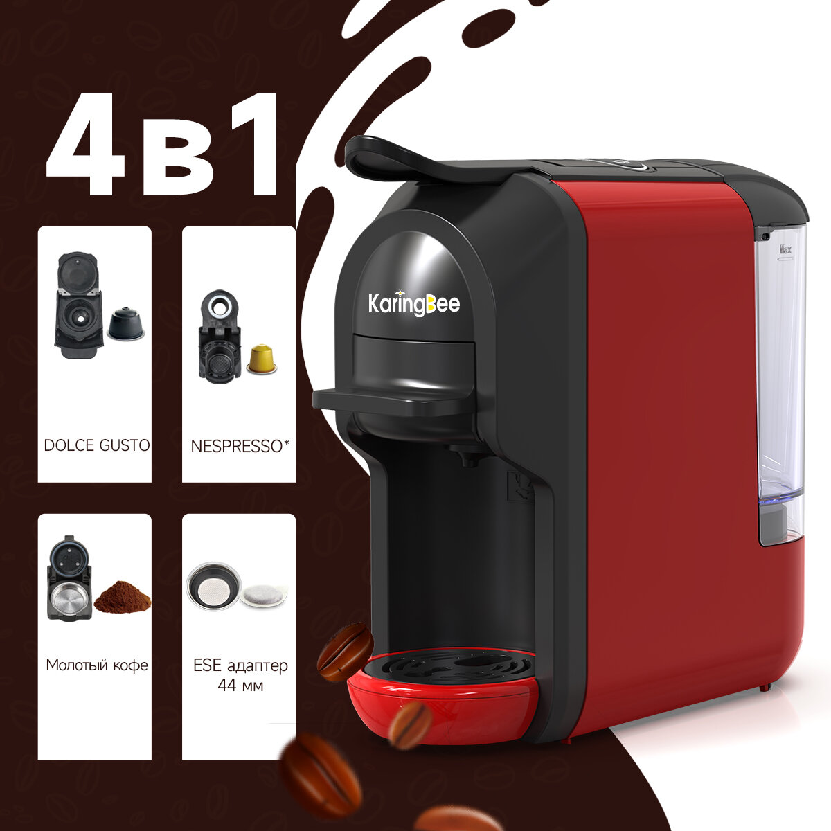 10 цен на Капсульная кофемашина KaringBee ST-510, 4-в-1 красный/мощность 1450 Вт и давлением 19 бар/эспрессо и американо/капсулы Nespresso+Dolce Gusto+ESE 44мм+молотный кофе