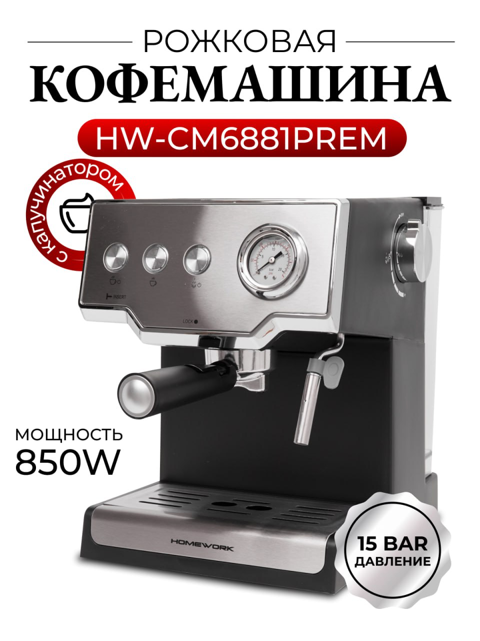 Рожковая кофемашина HomeWork CM6881PREM с капучинатором информация: