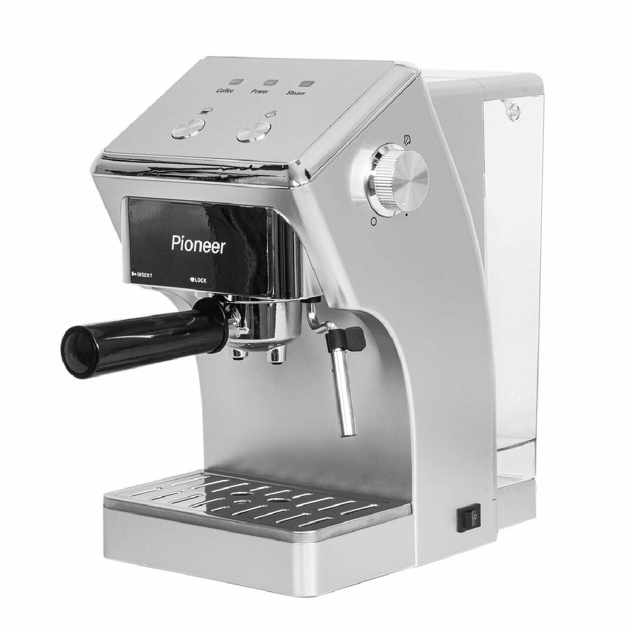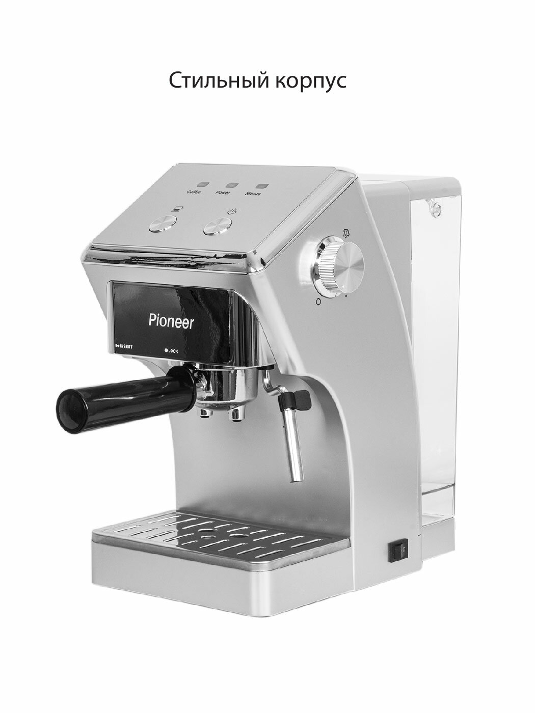 10 цен на Рожковая кофеварка для дома профессиональная Pioneer CM115P silver с капучинатором, электронное управление, эспрессо/капучино/латте, мгновенный нагрев