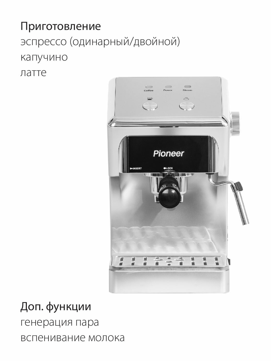 Рожковая кофеварка для дома профессиональная Pioneer CM115P silver с капучинатором, электронное управление, эспрессо/капучино/латте, мгновенный нагрев информация: