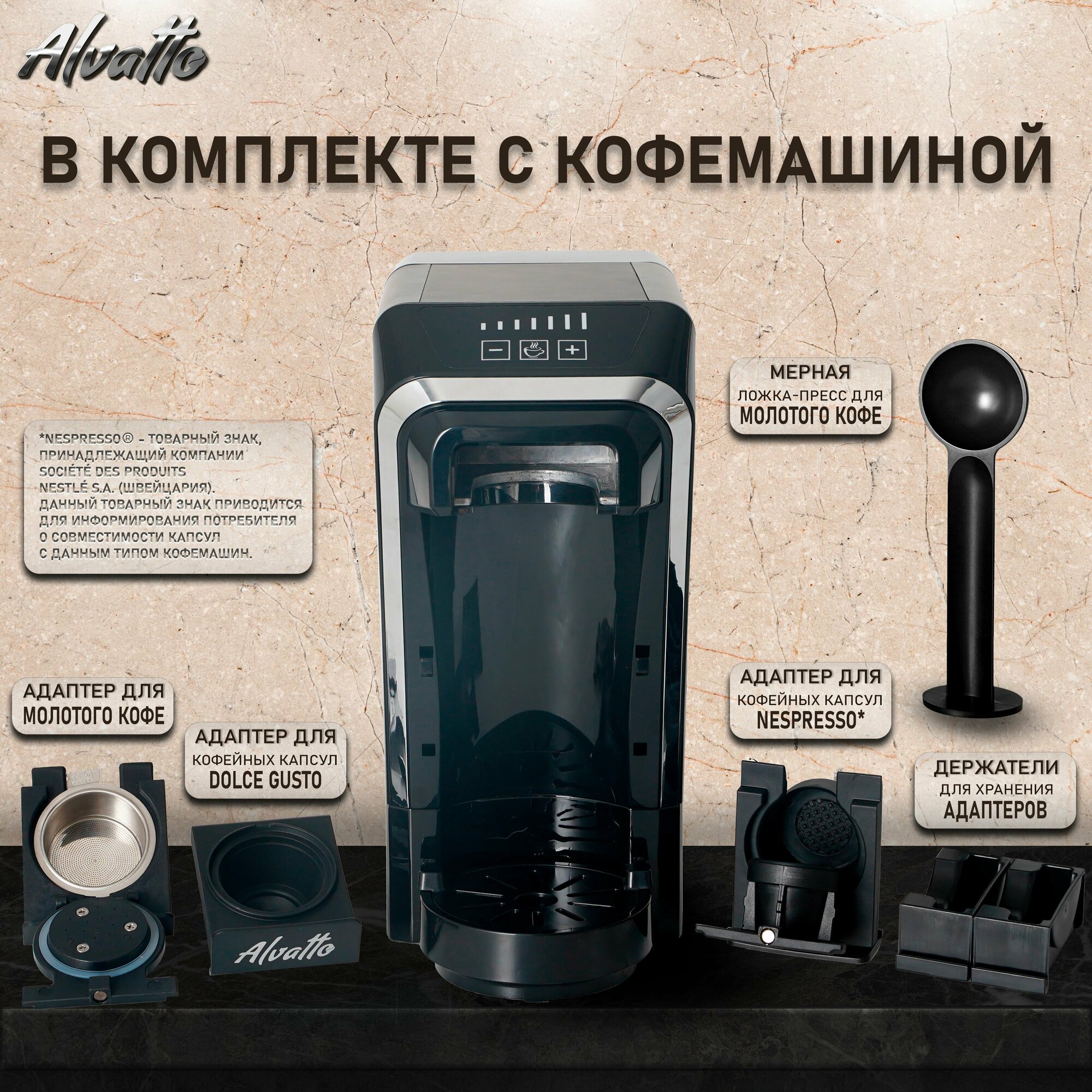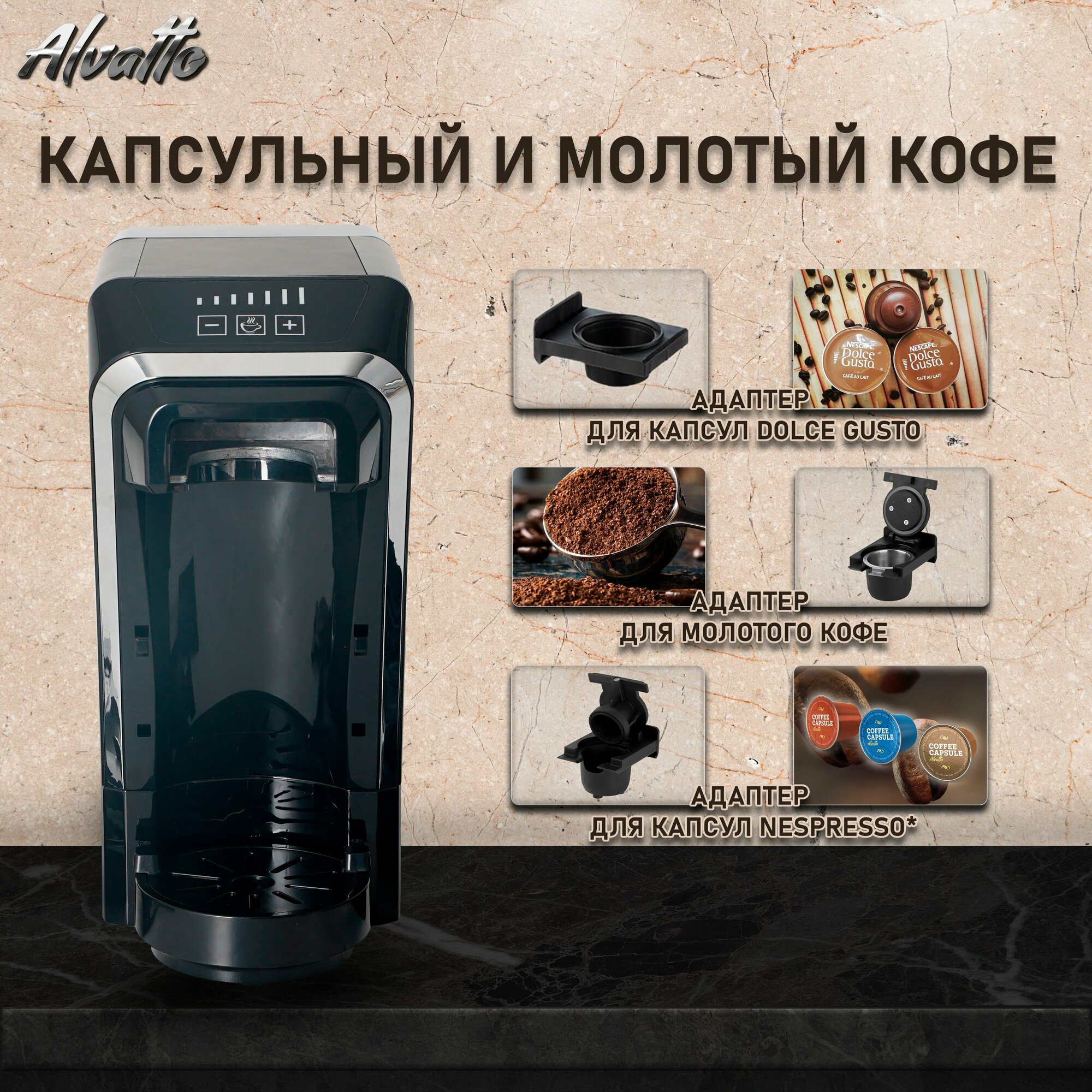 10 цен на Универсальная кофемашина Alvatto Due 3-в-1 с адаптерами для капсул Nespresso, Dolce Gusto и молотого кофе / Coffee Graphite
