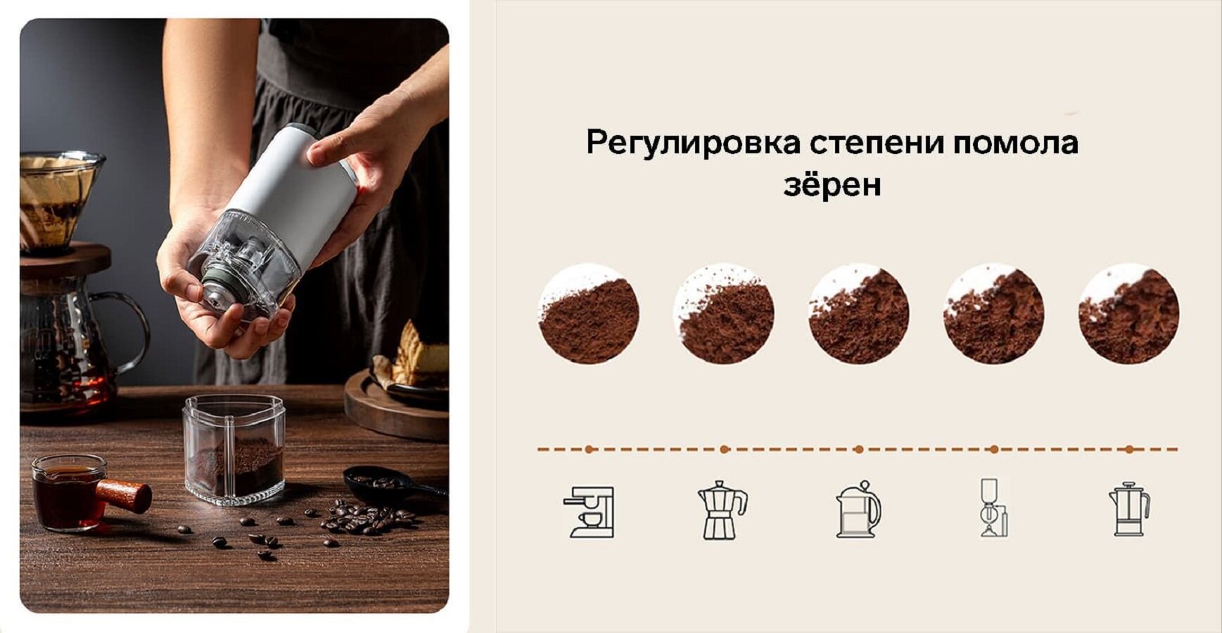 | Дополнительная информация | Портативная кофемолка; Электрическая кофемолка; Кофемолка для путешествий; Беспроводная кофемолка; Керамические жернова; Регулировка помола; USB-зарядка; Кофемолка для кофейных зерен; Мини кофемолка; Кофемолка на аккумуляторе; Кофемолка для дома; |