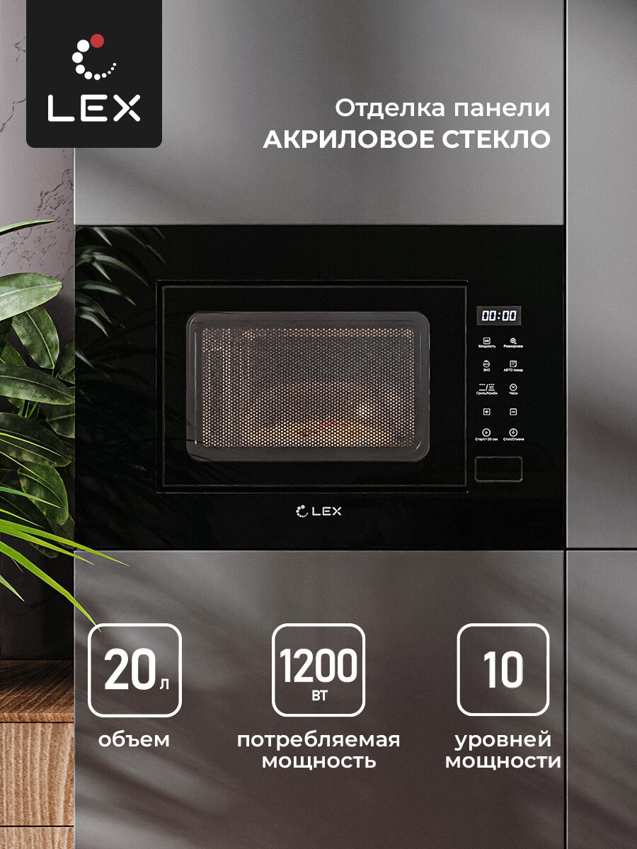 Микроволновая печь Lex BIMO 20.02 BL встраиваемая, объем 20 л, 9 режимов, 10 уровней мощности, черная информация: