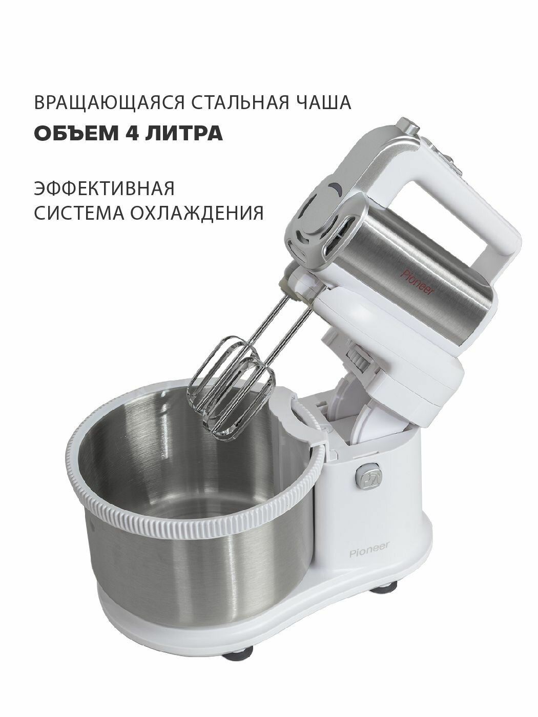 Миксер ручной Pioneer MX345 с вращающейся стальной чашей 4 литра, 5 скоростей, режим турбо, эффективная система охлаждения, 4 насадки, 450 Вт информация: