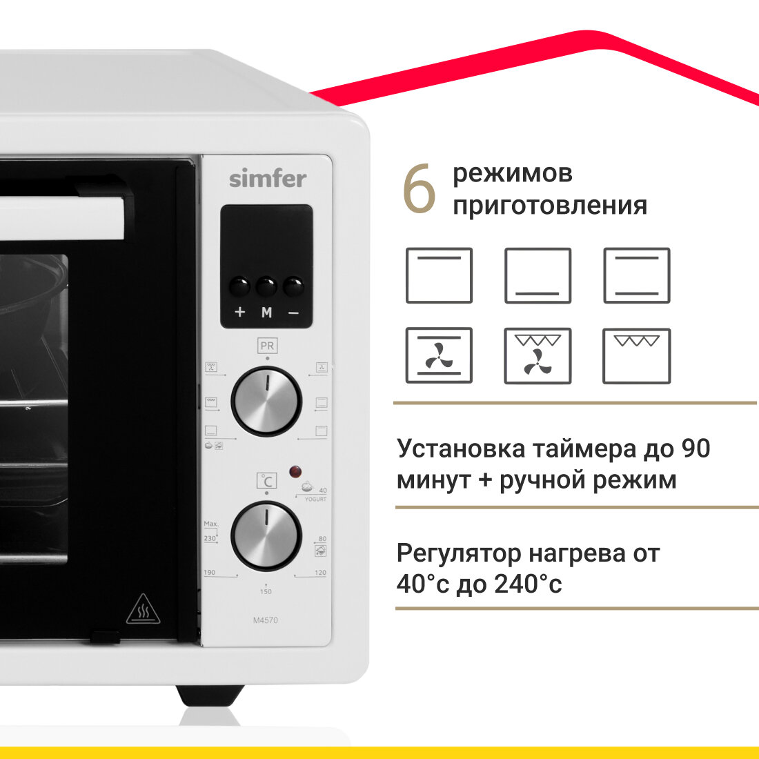 Мини-печь Simfer M4570 (6 режимов, конвекция, двойное стекло, цифровой дисплей, цвет белый) информация:
