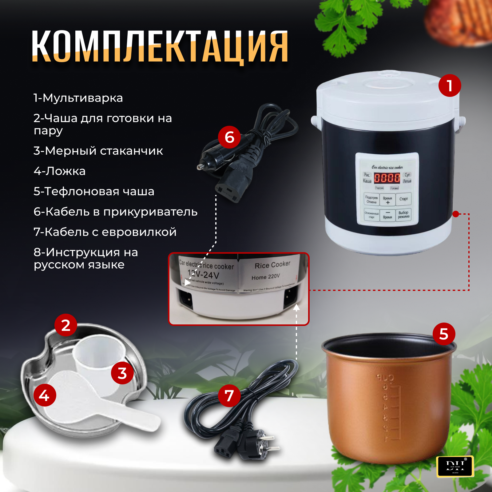 | Подробная комплектация | Мультиварка автомобильная, тефлоновая чаша, чаша для пароварки, ложка, мерный стакан, кабель подключения |