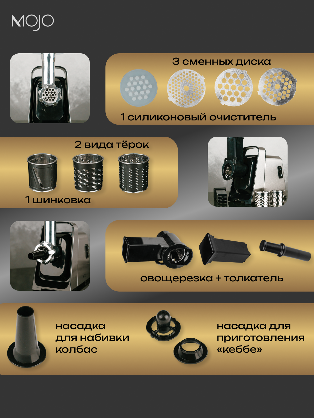 Мясорубка электрическая MOJO MJY-193 с овощерезкой, 1800 Вт, с насадками, с реверсом информация: