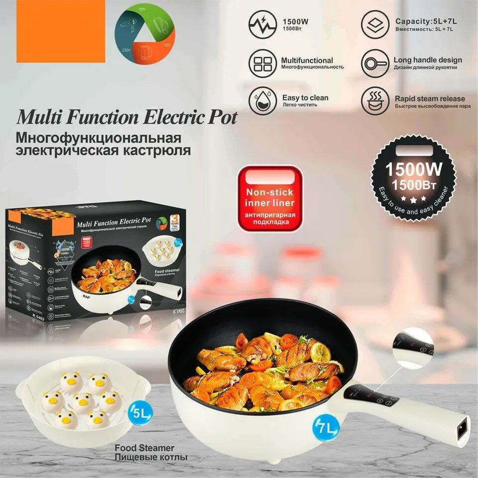 Электрическая сковорода, пароварка электрическая, домашние пароварки, 1500Вт, объем пароварки 5 и сковороды 7 литров, алюминий,5402 информация: