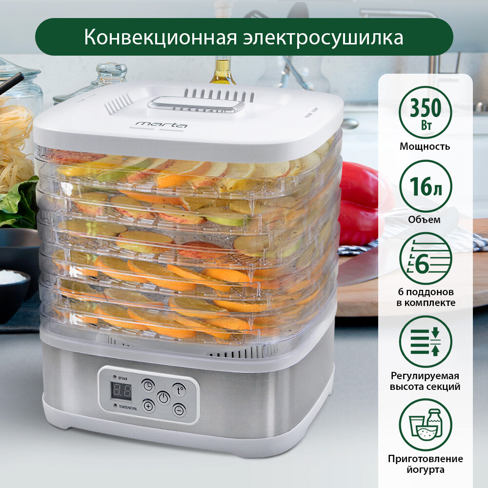 Мы выбрали 10 лучших цен на Электросушилка MARTA MT-1877 6 поддонов белый жемчуг. Перед тем как купить Электросушилка MARTA MT-1877 6 поддонов белый жемчуг посмотрите найденные предложения из Яндекс Маркета и других сайтов на основе XML фидов.