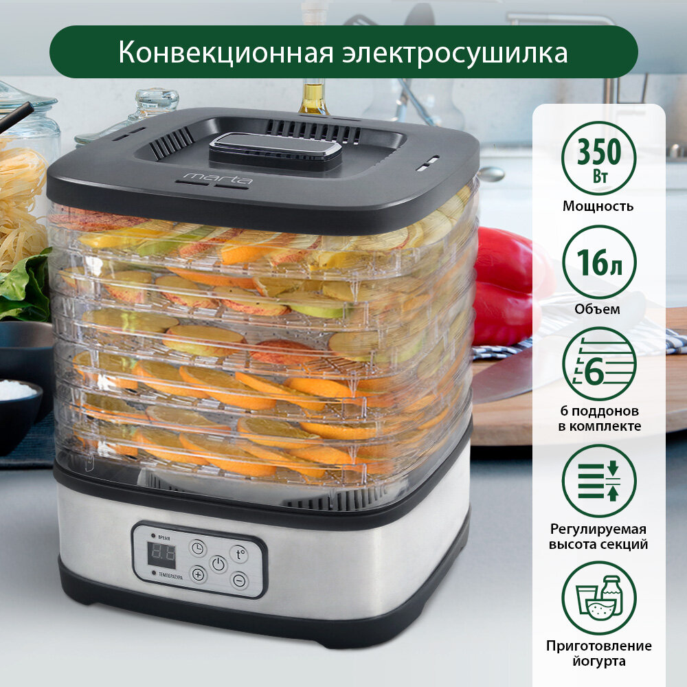 Мы выбрали 10 лучших цен на Электросушилка MARTA MT-1877 6 поддонов черный жемчуг. Перед тем как купить Электросушилка MARTA MT-1877 6 поддонов черный жемчуг посмотрите найденные предложения из Яндекс Маркета и других сайтов на основе XML фидов.