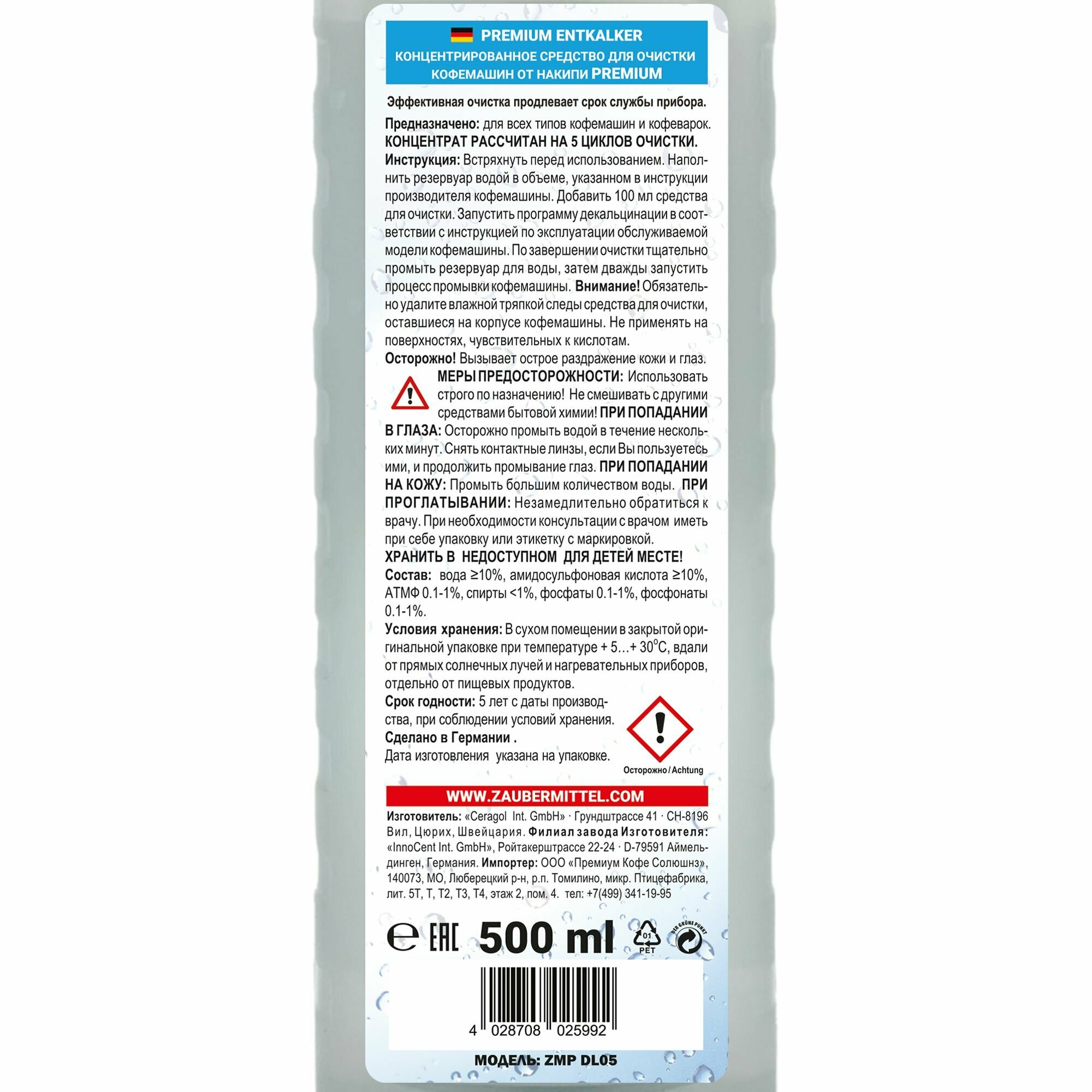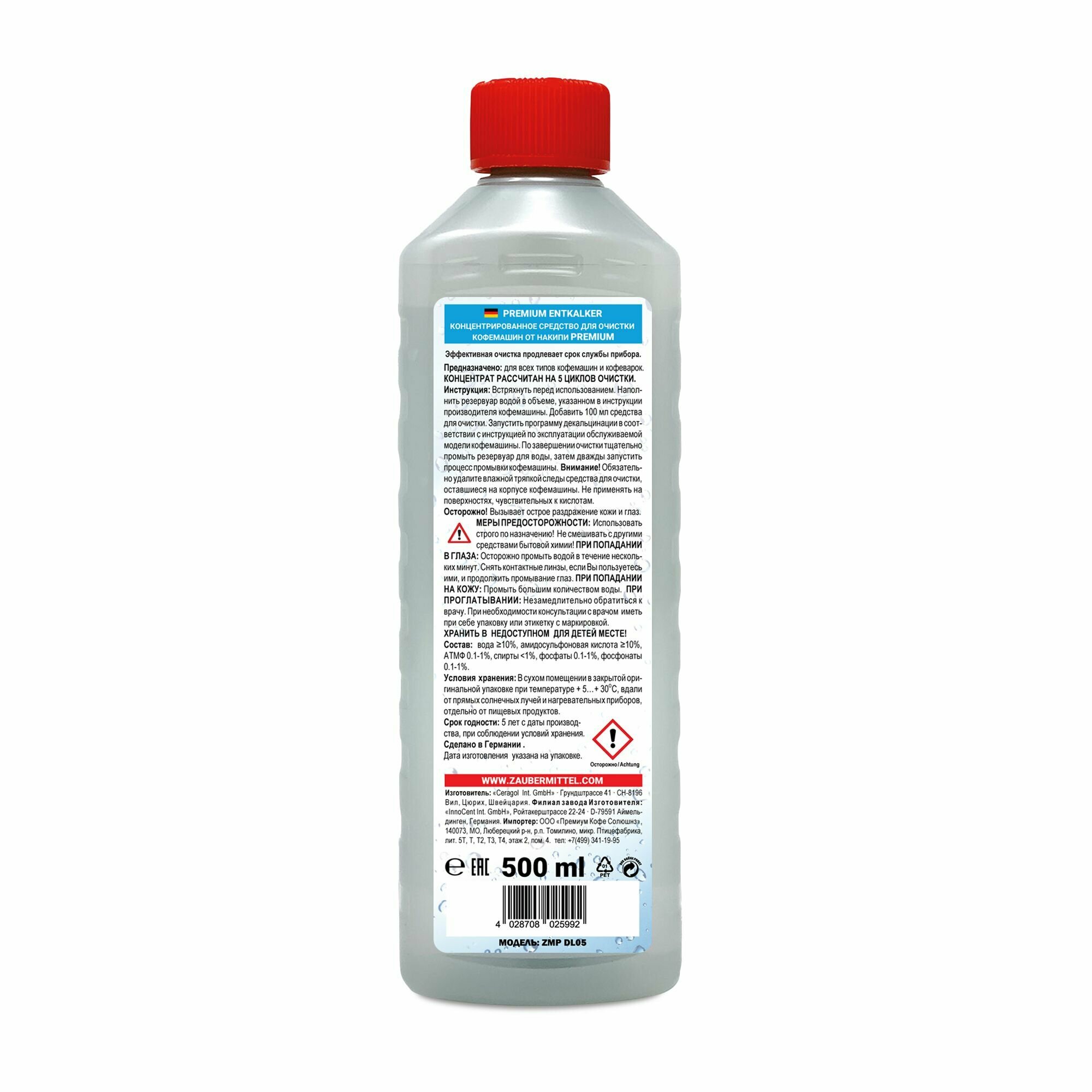 Жидкость для очистки от накипи ZauberMittel ZMP DL05, для декальцинации кофемашины информация: