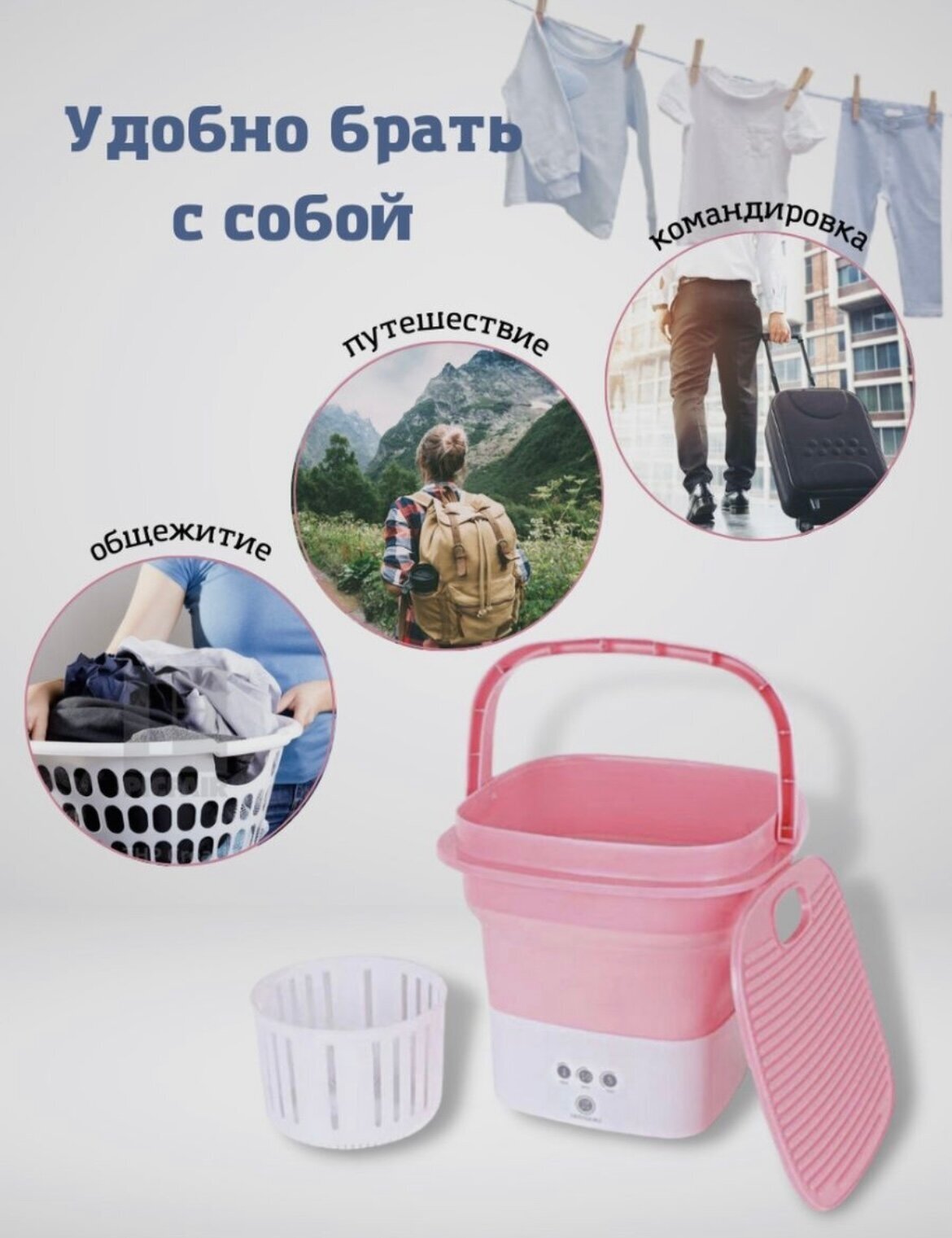 Отзывы на Портативная мини стиральная машина складная ведро розовое+Авторский магнит AlexShoping на холодильник