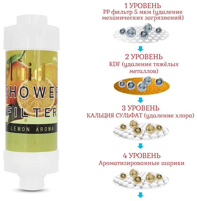 10 цен на Фильтр для воды, душа, ванной ароматический Fluidfit , защита от хлора, тяжелых металлов и примесей ( лимон )