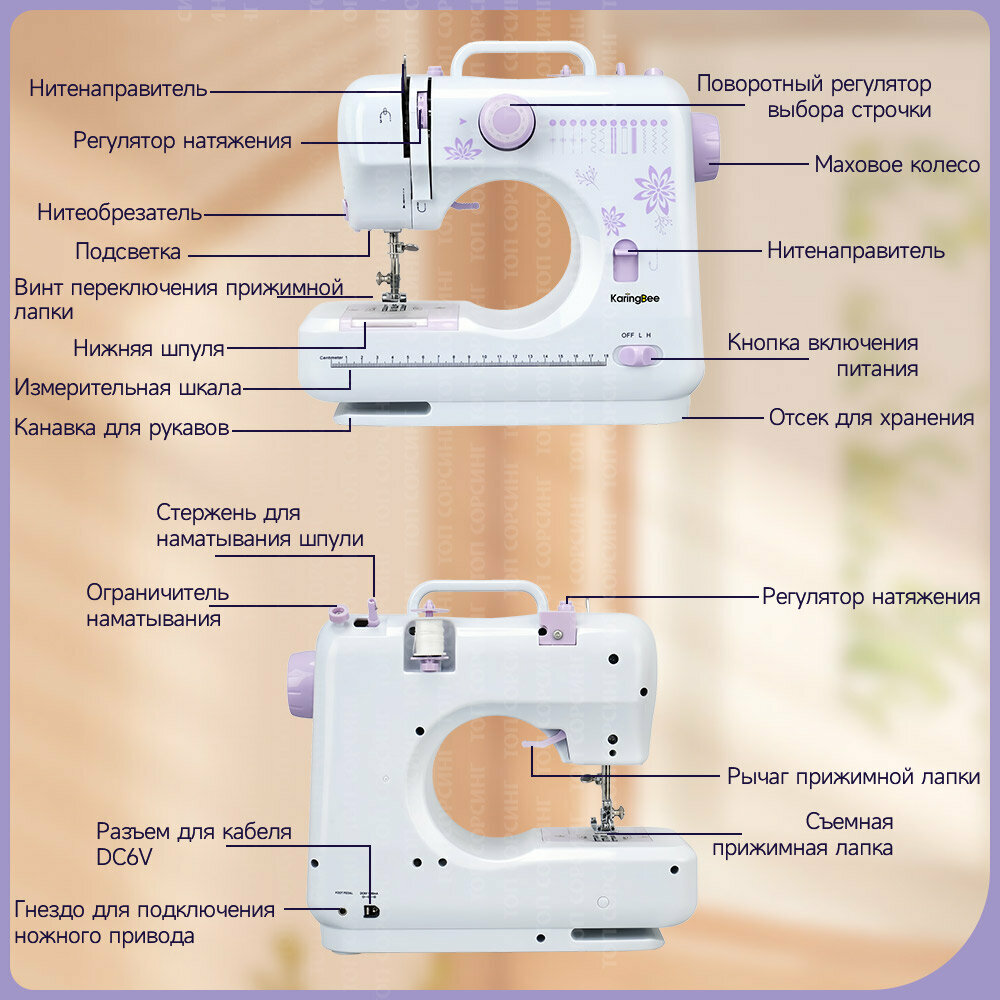 Швейная машина KaringBee FHSM-505G фиолетовый+Электрические ножницы, электрическая от сети, реверс, регулировка скорости, нитевдеватель и подсветка,12 видов строчек информация: