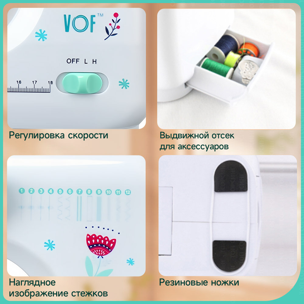 10 цен на Швейная машина KaringBee FHSM-505G зеленый+набор аксессуаров, электрическая от сети, реверс, регулировка скорости, нитевдеватель и подсветка,12 видов строчек