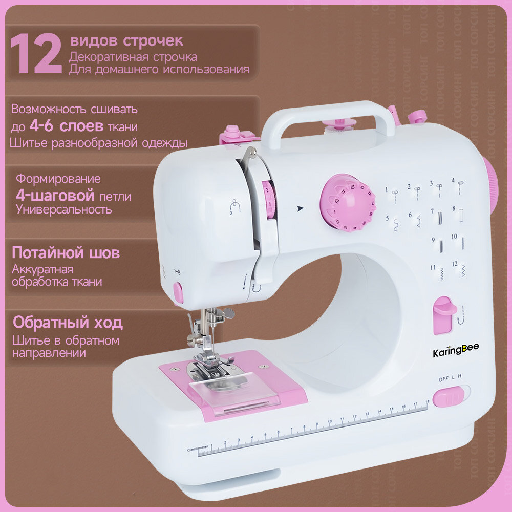 10 цен на Швейная машина KaringBee FHSM-505, розовая, электрическая от сети и батареек, реверс, регулировка скорости, нитевдеватель и подсветка,12 видов строчек