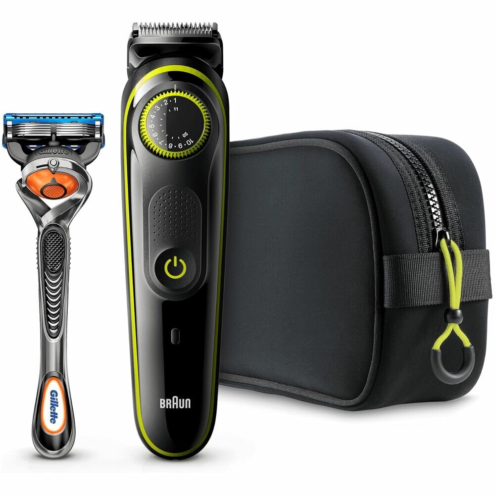 Триммер для бороды и усов Braun BT3941, интервал настройки 0.5 мм, бритва Gillette и дорожный чехол в комплекте, черный/зеленый