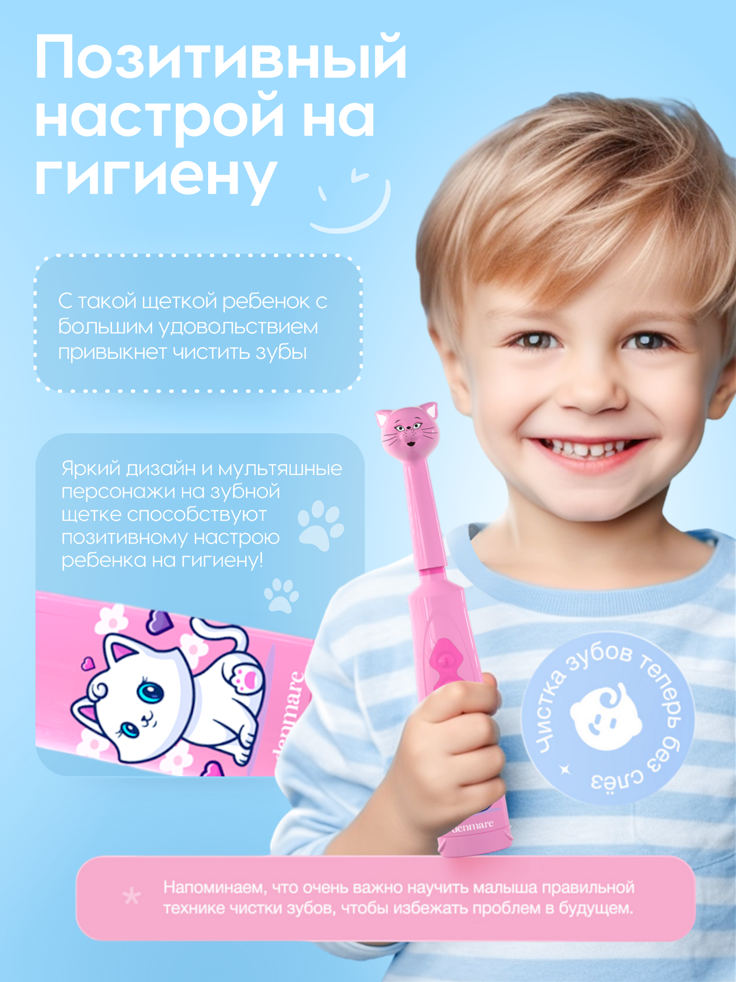 Детская электрическая зубная щетка DENMARE KIDS DM-01-1 (Pink cat) информация: