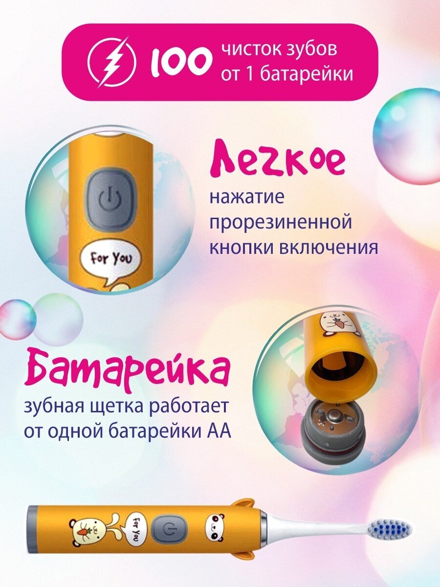 Электрическая зубная щетка детская, Оранжевая ультразвуковая электрощетка для детей от 3х лет на батарейке АА с доп. насадками информация: