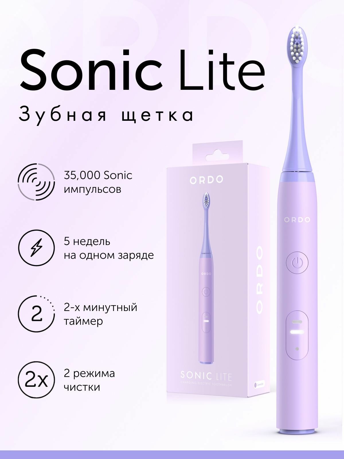 Электрическая зубная щетка ORDO Sonic Lite Lavender с 2 режимами, таймером и кабелем для зарядки, фиолетовая информация:
