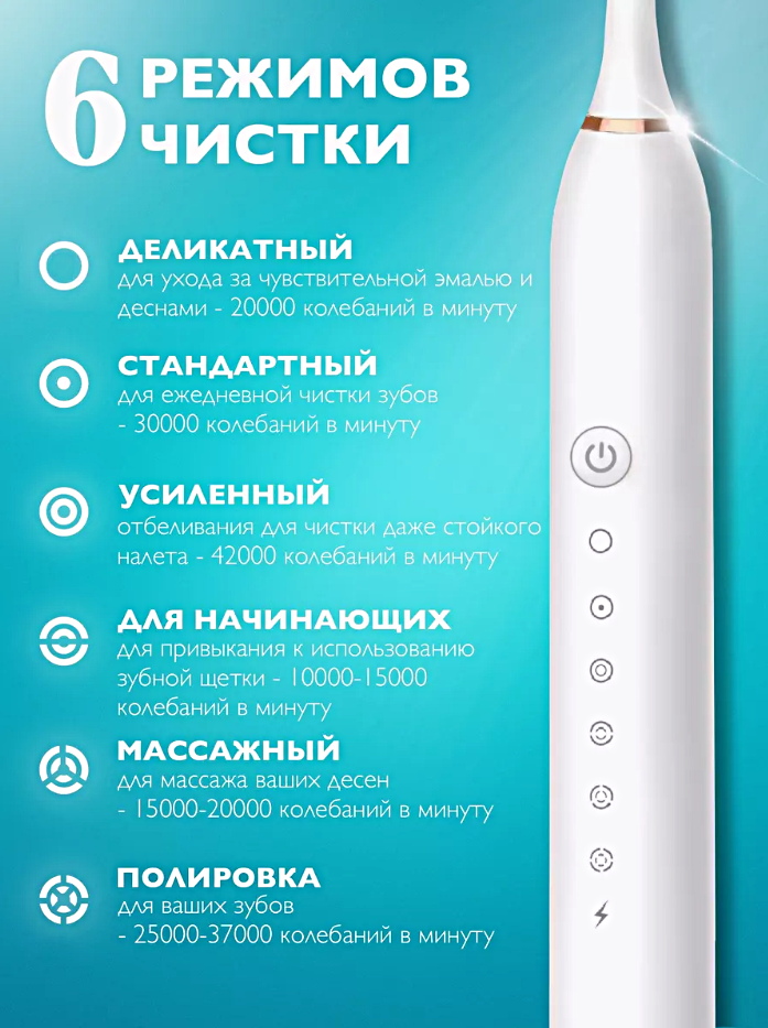 Ультразвуковая электрическая зубная щетка Х-3, 6 режимов работы, 4 насадки в комплекте, Электрическая щетка для детей и взрослых, Белый информация: